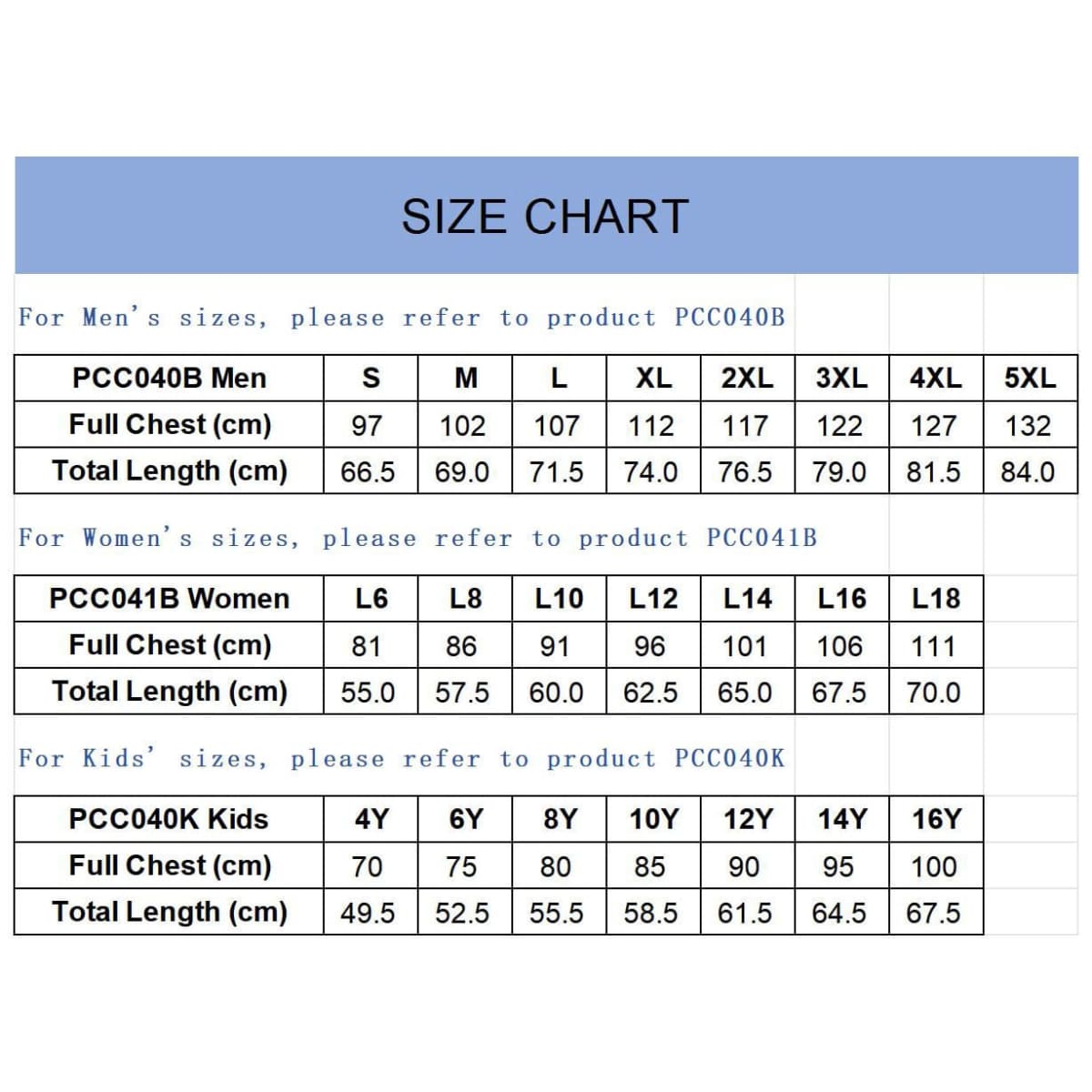 Size S: chest width = 97cm; Body length = 66.5cm Size M: chest width = 102cm; Body length = 69cm Size L: chest width = 107cm; Body length = 71.5cm Size XL: chest width = 112cm; Body length = 74cm Size 2XL: chest width = 117cm; Body length = 76.5cm S
