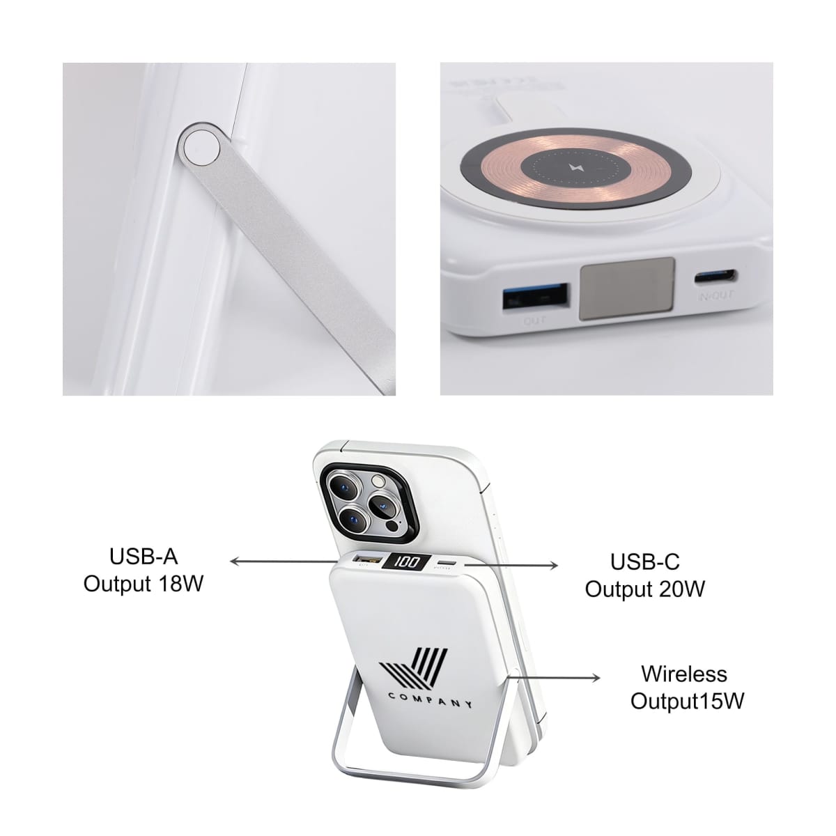 Create your own charging essential with our new 10000mAh Magnetic Wireless Power Bank with Phone Stand! Made of durable, lightweight ABS material. With digital UV print and screen printing to highlight your design. Our power bank is suitable for home, office, travel and outdoor use. Customised logos can enhance brand promotions. This 10000mAh power bank features 15W magnetic wireless fast charge, 22.5W output and 18W input fast charge, plus a built-in phone stand, offering users a high-quality, practical and convenient charging solution for daily use.