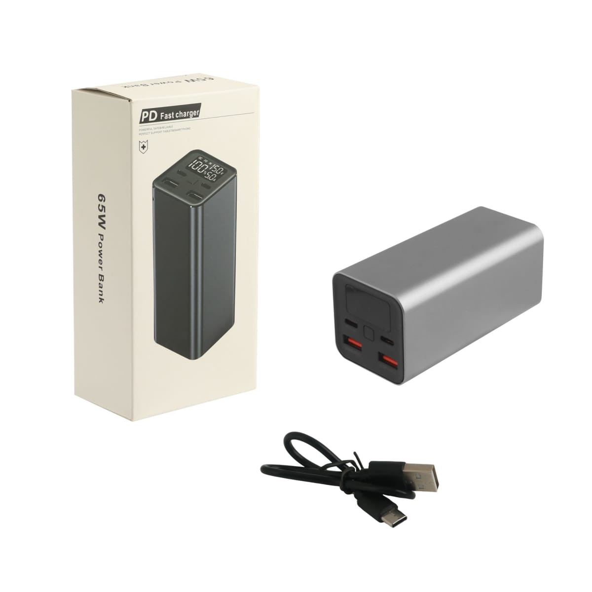 Keep your laptop powered on the go, with our 20000mAh 65W Laptop Power Bank! Made of aluminum and plastic, it is available in black, silver, and dark blue, and offers engraving and UV Print to add your desired design. The power bank has enough power to charge a laptop, and a vibrant LCD digital display to show battery level, voltage and current levels. Four devices can be charged at the same time and continuously powered, simplifying the charging equipment you need to carry, which makes it an ideal companion for work or travel.