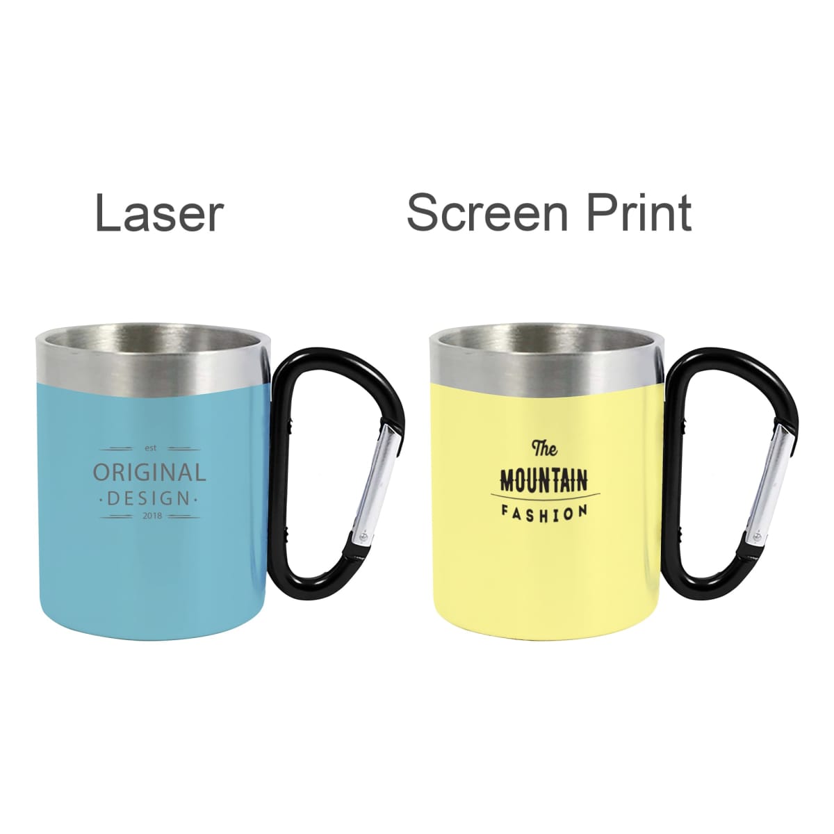 Take your favourite beverages anywhere with our compact 200ML double-walled mug featuring a convenient carabiner handle for easy attachment to backpacks or gear. Made from eco-friendly recycled stainless steel, this durable mug is perfect for outdoor enthusiasts who value sustainability. The insulated double-wall design keeps drinks at the ideal temperature whether you're camping, hiking, or commuting. Customise both the mug body with your choice of colours and add your logo via screen printing, engraving for standout branding. Lightweight yet sturdy, this versatile mug is ideal for outdoor adventures, travel, or everyday use while keeping your brand visible on the go.