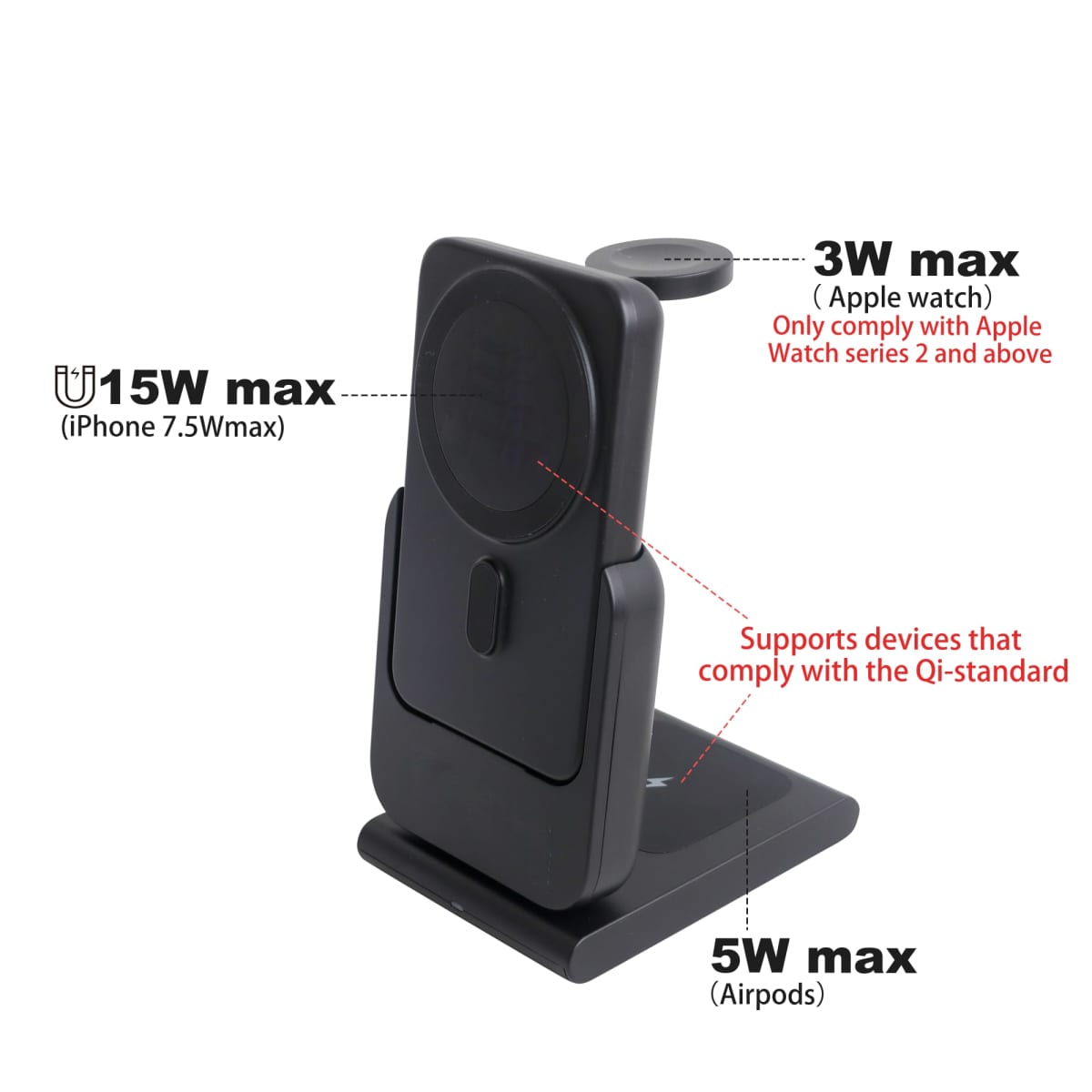 Boost your brand with our new 3 in 1 5000mAh Power Bank Charging Station! Made of ABS material and silicone, it offers superior quality and an exquisite tactile experience. With a detachable 5000mAh power bank, it ensures your devices are recharged throughout the day. Designed for versatility, this charger supports phone, Apple watch, and AirPods charging. Highlight your brand through screen printing or laser engraving. With this multi-functional wireless charger, you will not only eliminate the need for messy chargers and cables but also can use it as a phone stand. Don't miss out on the chance to enhance your brand presence!