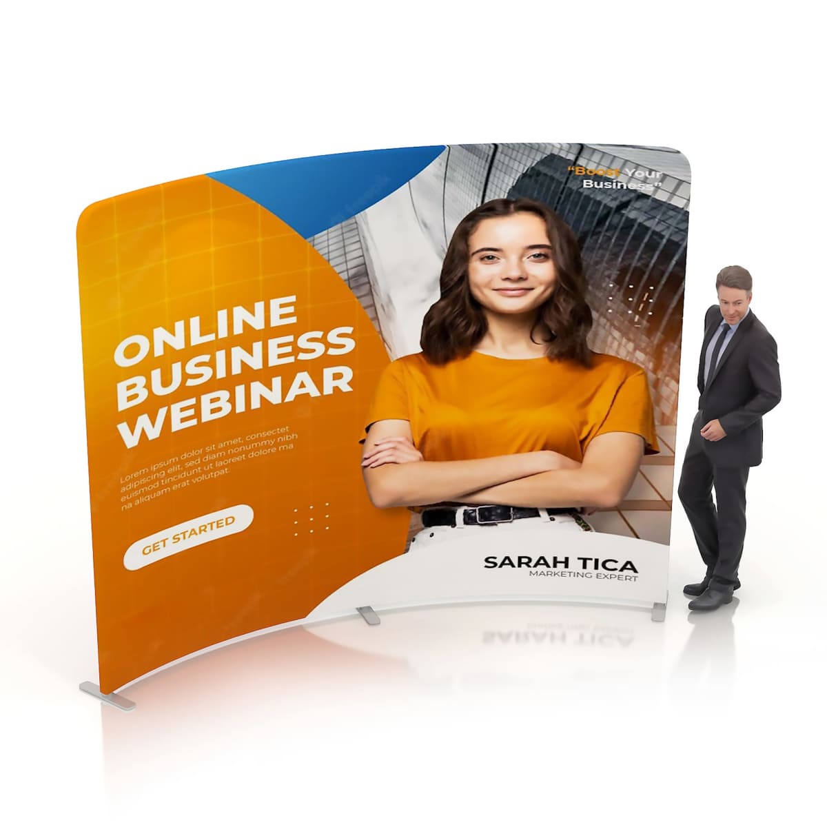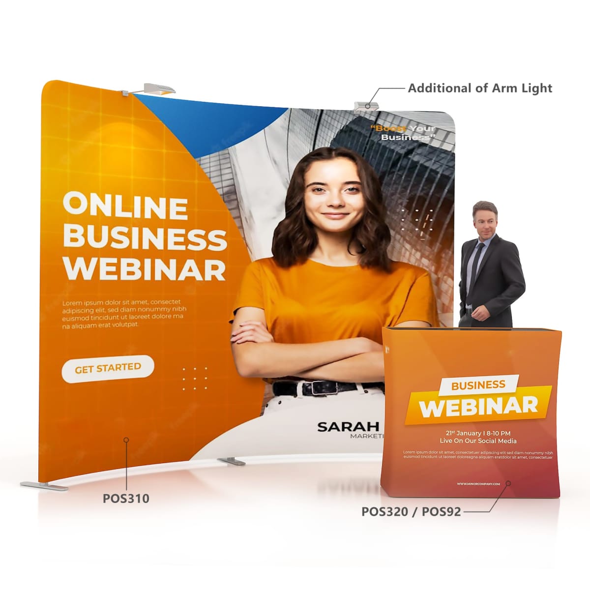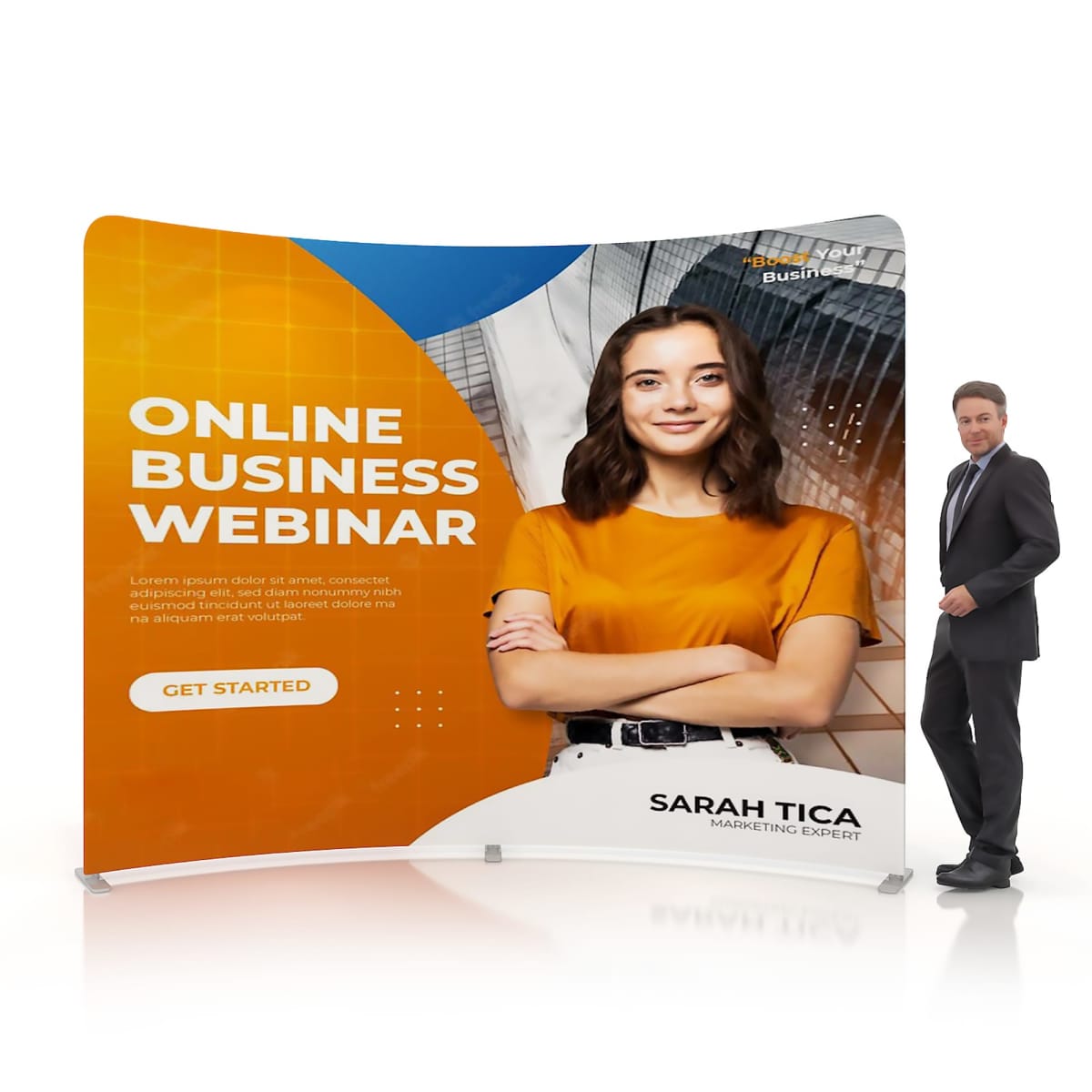 Get your branding seen at your next event, with our new display wall. The lightweight and strong aluminum frames are powerfully-built to sustain the fabric's stretch over long periods of time. The aluminum tube has a snap-lock function that can be easily assembled without tools. Made of Eco-friendly materials and reusable structure. Supporting customization via full surface sublimation printing. Can also be printed on both sides. Use our printed fabric wall banner as a background for stages, events, photobooths, press conferences, award ceremonies and more.