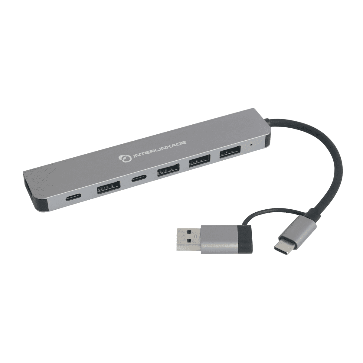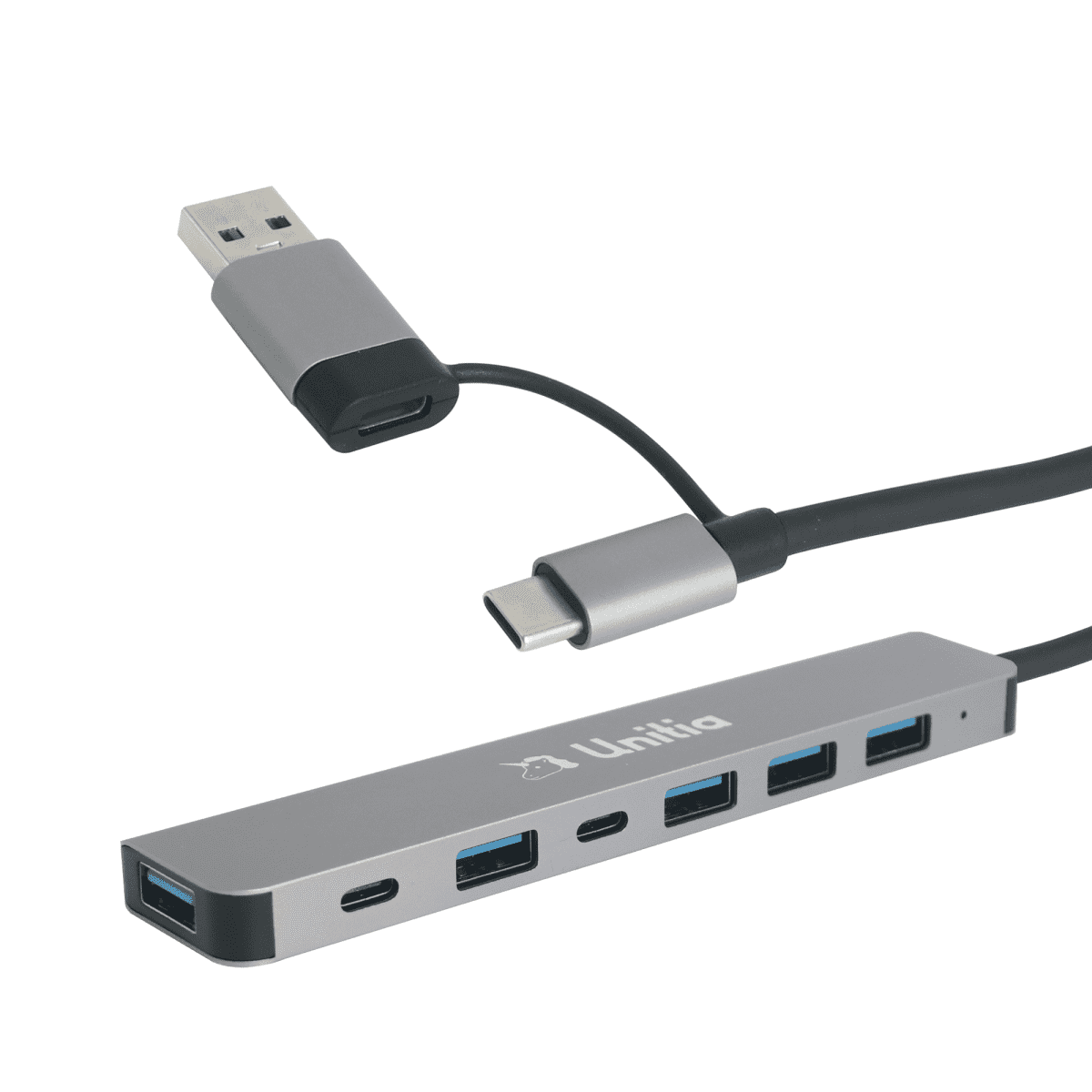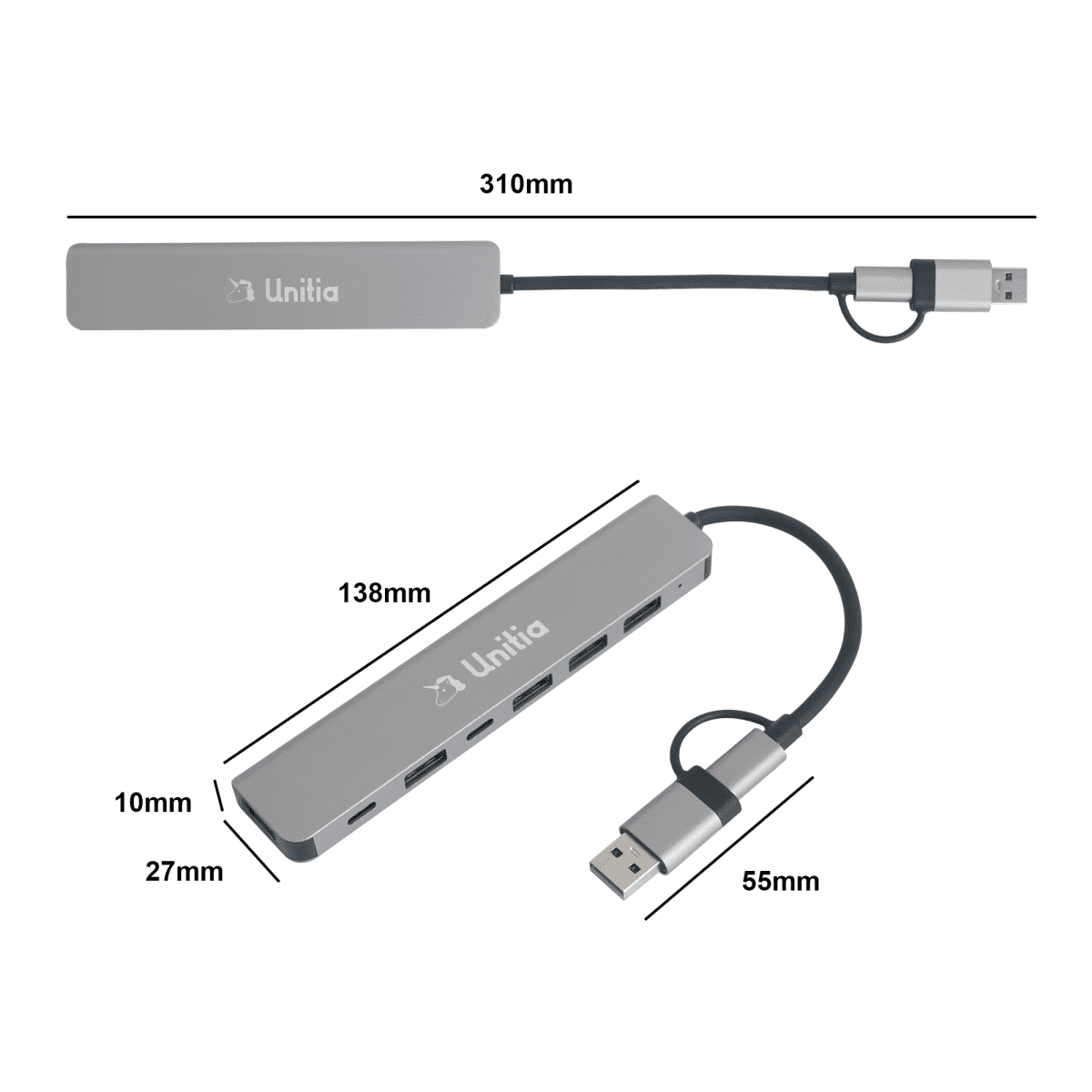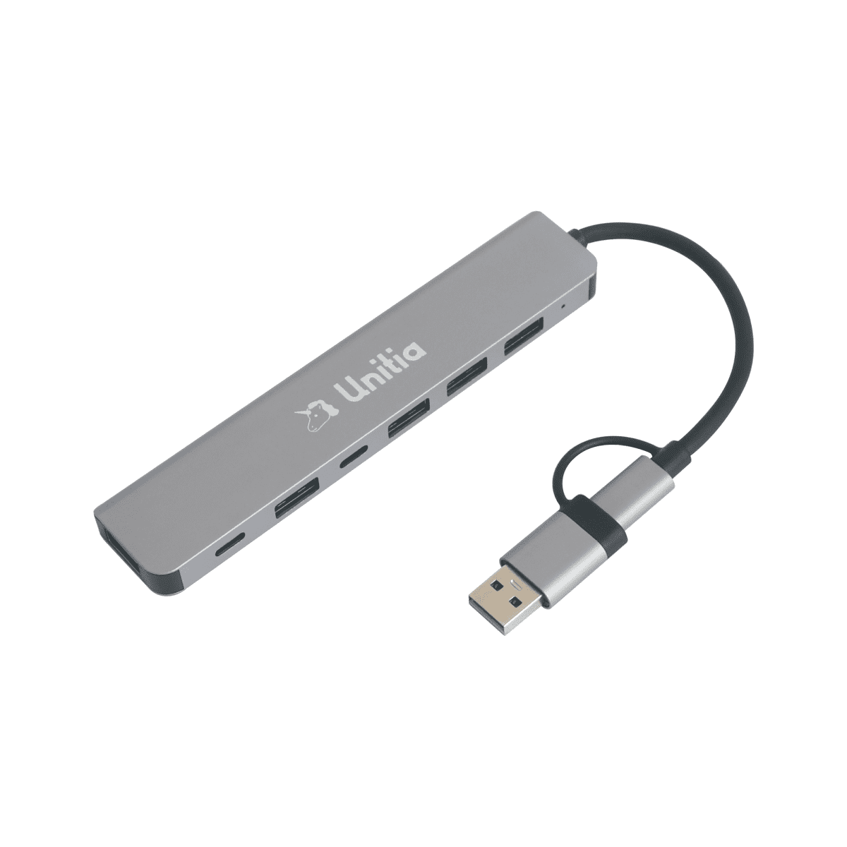 Boost your laptop's connectivity and get your brand seen, with our 7 in 1 USB hub. Made of aluminum material, it is durable and powerful. Complete with engraving on the hub to showcase your design. Compatible with MacBook, Windows laptops, and iPads, it's the perfect accessory for seamless multitasking. Features 1 USB 3.0 port, 4 USB 2.0 ports, and 2 USB/C DC data ports, which can be used with flash drives or other standard USB and Type-C devices. A practical gift, sure to be used over and over.
