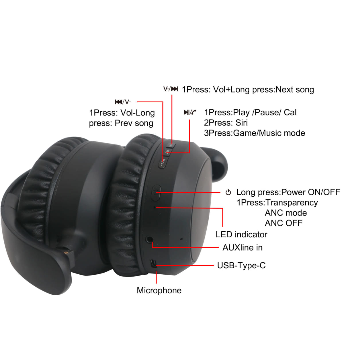 Enjoy your music with greater clarity, with our ANC Bluetooth Headphones. These headphones are equipped with easy-to-use buttons for song selection, volume control, The headphones are equipped with a microphone, which enables hands-free calls and good call sound quality. The earmuffs are comfortable and breathable and can be worn for extended periods in comfort. The battery capacity is 400mAh, and Music/Talk times-normal mode: About 50h .Music/Talk times-ANC mode: About 25h, Active Noise Reduction: 28DB±3dB. Bluetooth Specification: V5.3. The headphone package includes Type-C charging cable, auxiliary cable and user manual. We will customize your brand logo with screen print, UV print.