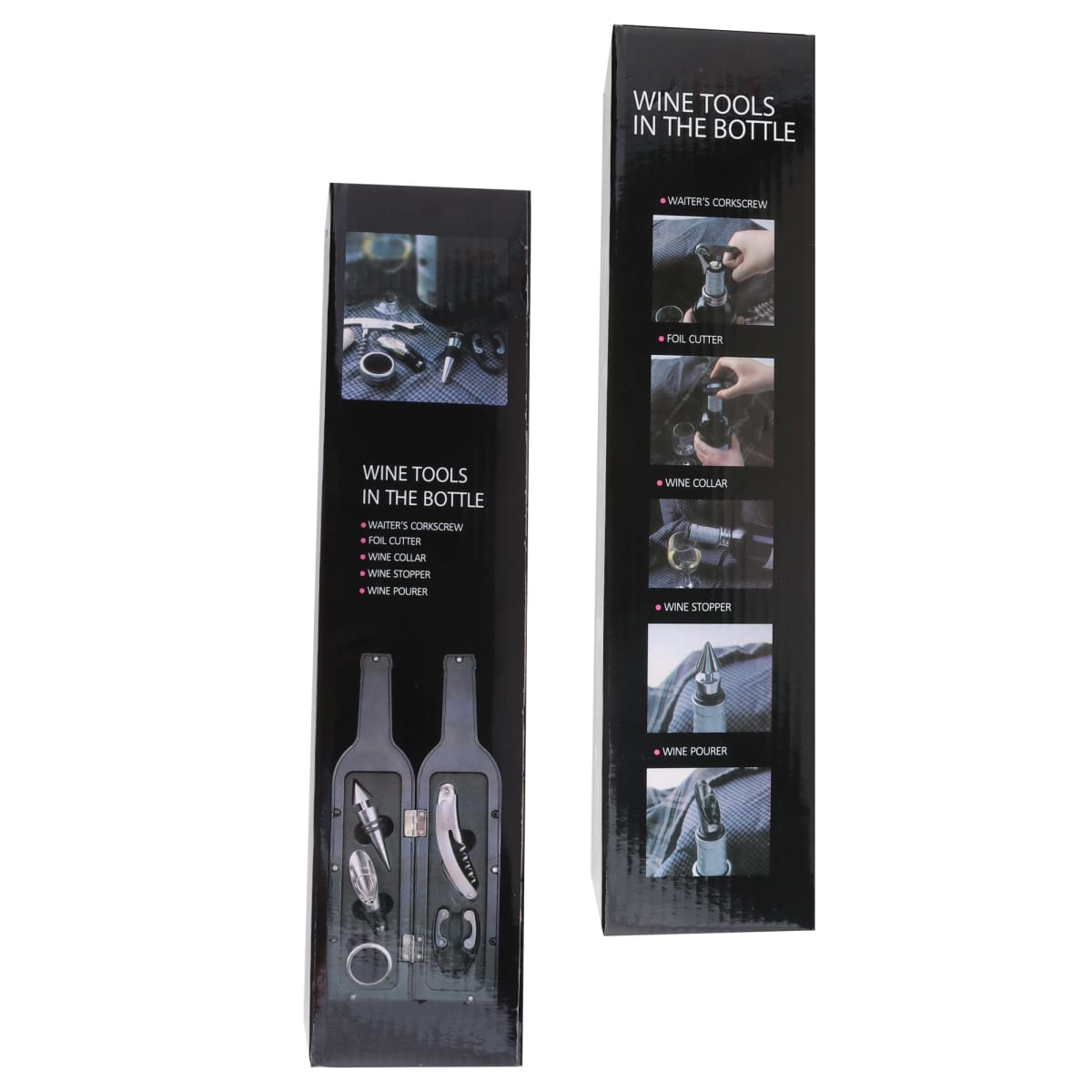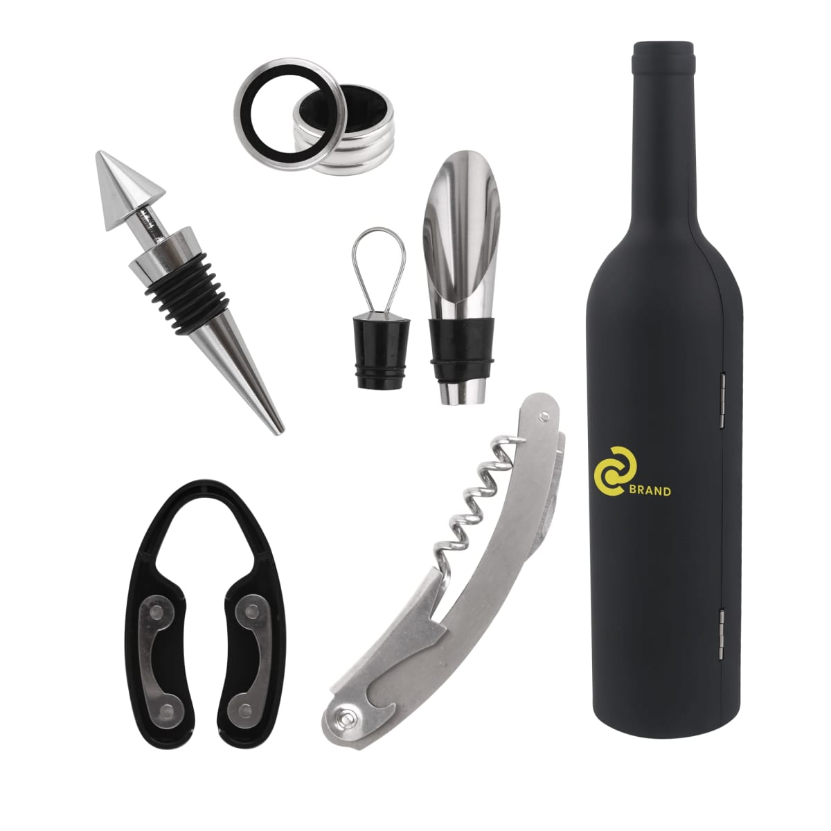 Never be caught short of wine tools again, with our complete win tool set. Featuring a variety of tools, that can be used in any wine drinking situation. Set Includes combo corkscrew bottle opener, drip stop ring, stopper, foil cutter and combo pourer stopper. All tools conveniently store inside the carrying case