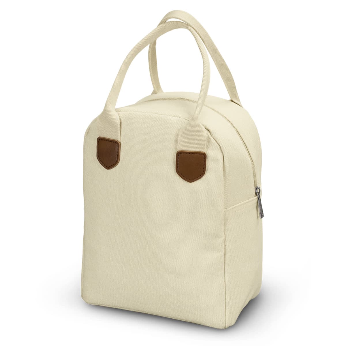 Stylish lunch bag made from robust 450gsm cotton canvas with PE foam insulation and a water-resistant PEVA lining. The cotton carry handles have leather-look PU accents, and the bag has a zippered main compartment with a slip pocket at the front. Features: * Stylish insulated lunch bag made from 450gsm cotton canvas * PE foam PU insulation with a water-resistant PEVA lining * Cotton carry handles with leather-look PU accents * Zippered main compartment and a slip pocket