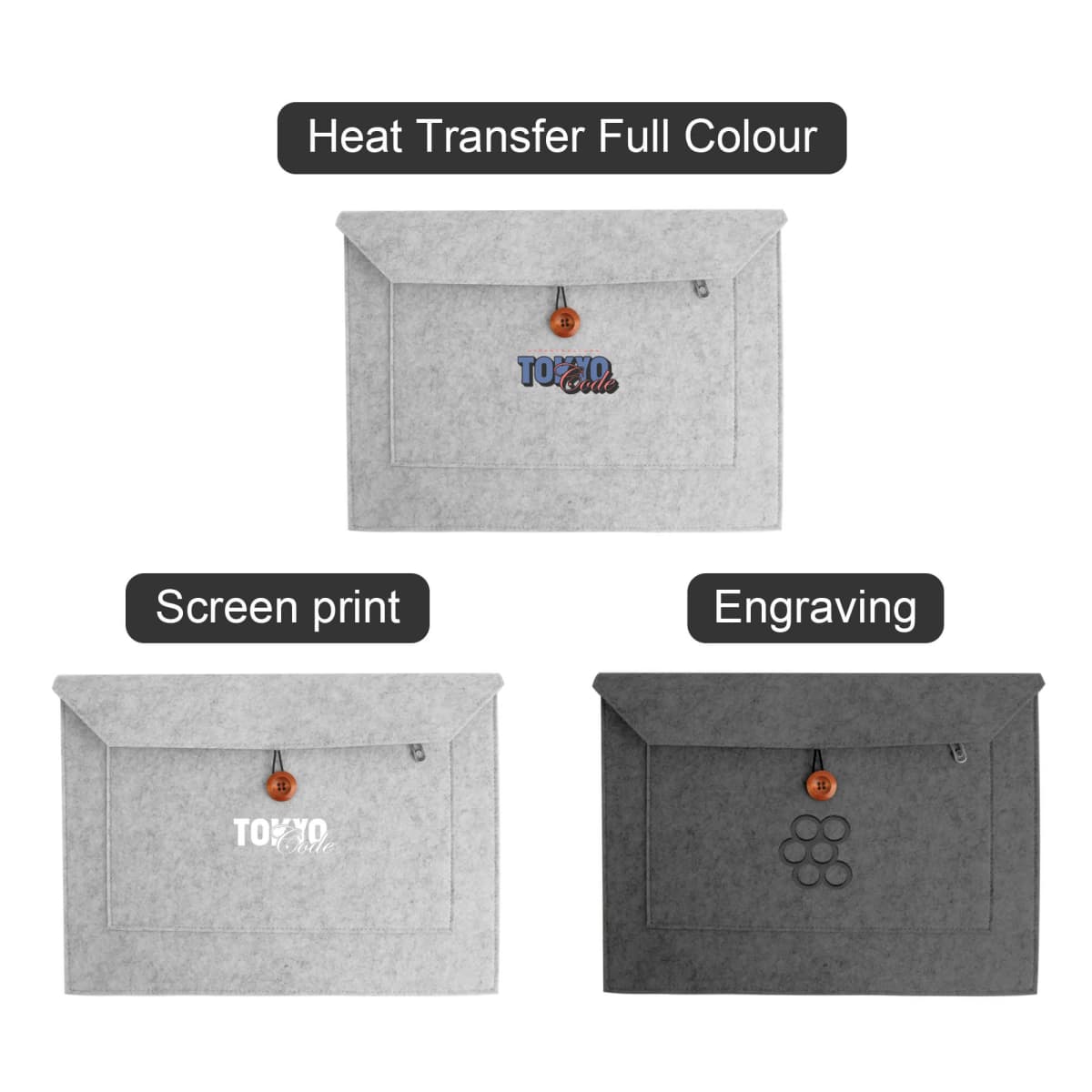 Create your own unique custom office items with our Custom Felt Laptop Bag! Made from RPET felt material, which is durable and eco-friendly. Protect your laptop with this felt laptop case, providing reliable protection against scratches and collisions. Our laptop bags are designed to be lightweight and easy to fit into other briefcases or backpacks for effective protection. With engraving, screen print, or heat transfer to highlight your brand, this felt bag is an excellent choice for promotional gift.