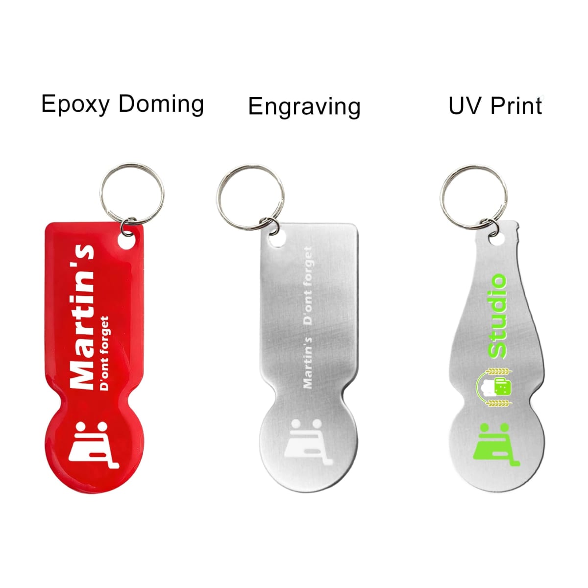 Elevate your brand with our Custom Shape Trolley Coin Keyring, crafted from high-quality stainless steel. Customised shapes can be made within dimensions of L61 x W23 x H1.6mm. Showcase your logos or designs on the front using epoxy doming for a smooth finish. Additional customisation is available on the back through UV printing or Engraving. Our keyring combines multiple functions, serving as a trolley coin and a keychain. Perfect for retail promotions, corporate gifts, or event giveaways.