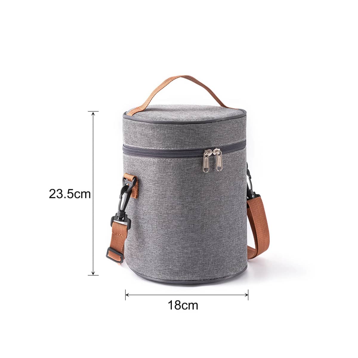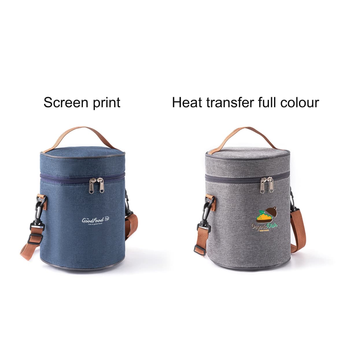 Our Cylindrical Lunch Bags are made of 300 Oxford cloth, for great durability. They are lined with aluminium foil inside, which can effectively maintain the temperature of the food. With adjustable shoulder strap and handle, they can be carried easily. With screen print or heat transfer to highlight your logo. Ideal for travel, picnics, school or office.