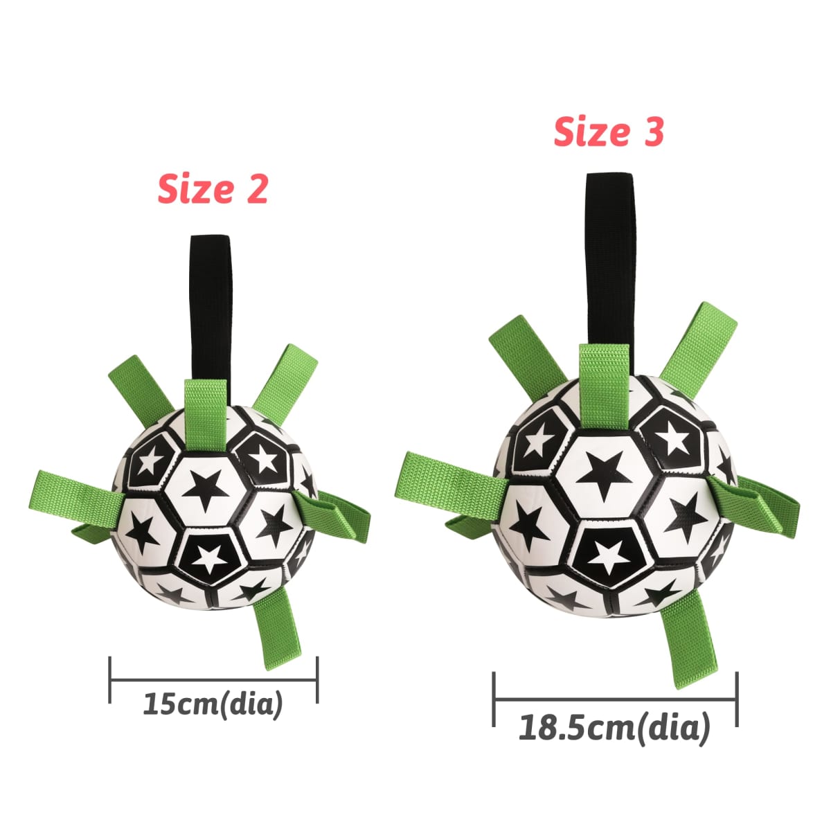 Kick some goals with your best friend, with our great new dog soccer ball. Manufactured from PU material for greater durability. Features unique nylon tabs sewn into the ball seams, allowing your dog to fetch, toss, tug and retrieve. There are 9 handy grab tags, great for games of toss, fetch and even tug. Our dog soccer ball is suitable for most dogs, and is not to be used as a chew toy. Perfect for outdoor play, swimming pools and the beach.
