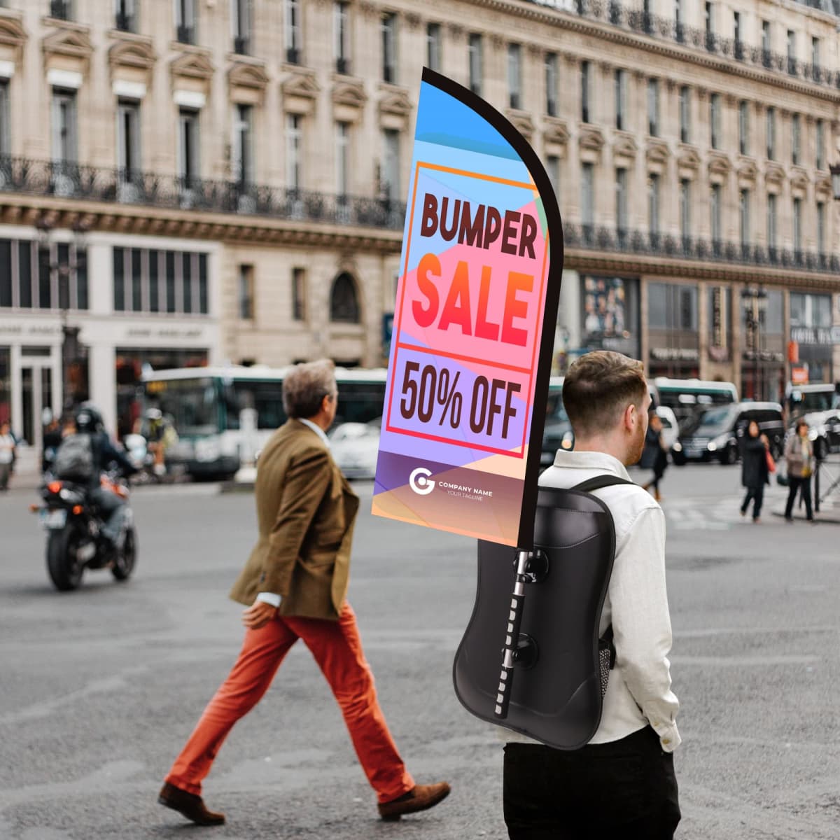 Our Backpack Flags are lightweight, comfortable, and cost-effective way to advertise your brand or products while walking. Stand out in a crowd, became a spotlight! Backpack Flags are perfect for any kind of event, like festival activities, exhibitions, and procession. Colorful painting helps you to catch people's attention from a distance, in all directions. Come with a high-quality backpack and adjustable shoulder straps. We provide three options of flag shapes designed in your own pattern, which are durable and reusable. Easily to set up Backpack Flags just in minutes.