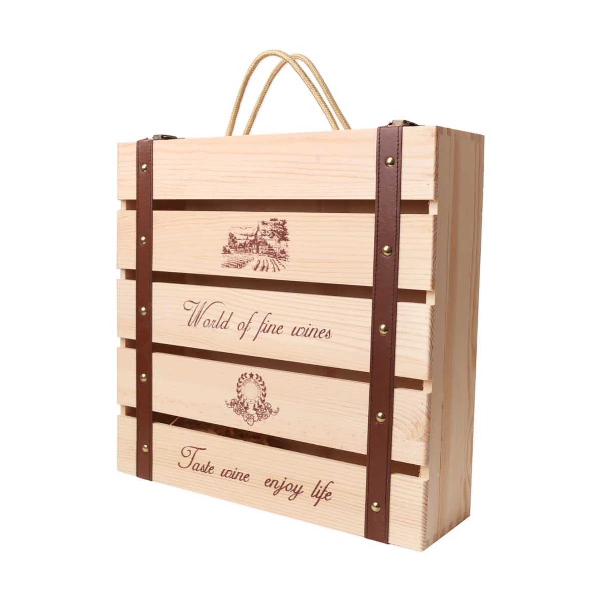 This Four Bottle Wooden Wine Box can easily store four bottles in style. Made of selected pine wood, is your unique exclusive high-grade gift box. It comes with a vintage nylon handle, decorated with a light burn belt and fine workmanship. Supports customised logos.