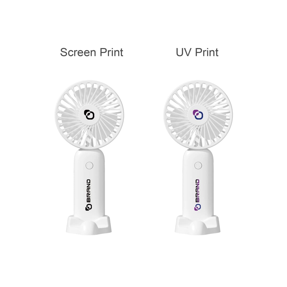 Fend off the heat no matter where you are with our Handheld Fan with Phone Stand! Crafted from high-quality ABS material, it's durable and light. Its built-in phone stand allows you to prop up your fan vertically—ideal for watching videos, making video calls, or following recipes while enjoying a cool wind. The max use time is about 2 hours. Choose from 3 fashionable colours to match your personal vibe. Customize it with pad print or UV print. Each package includes a standard box and a charging cable. Stay cool with this must-have accessory in you daily life!