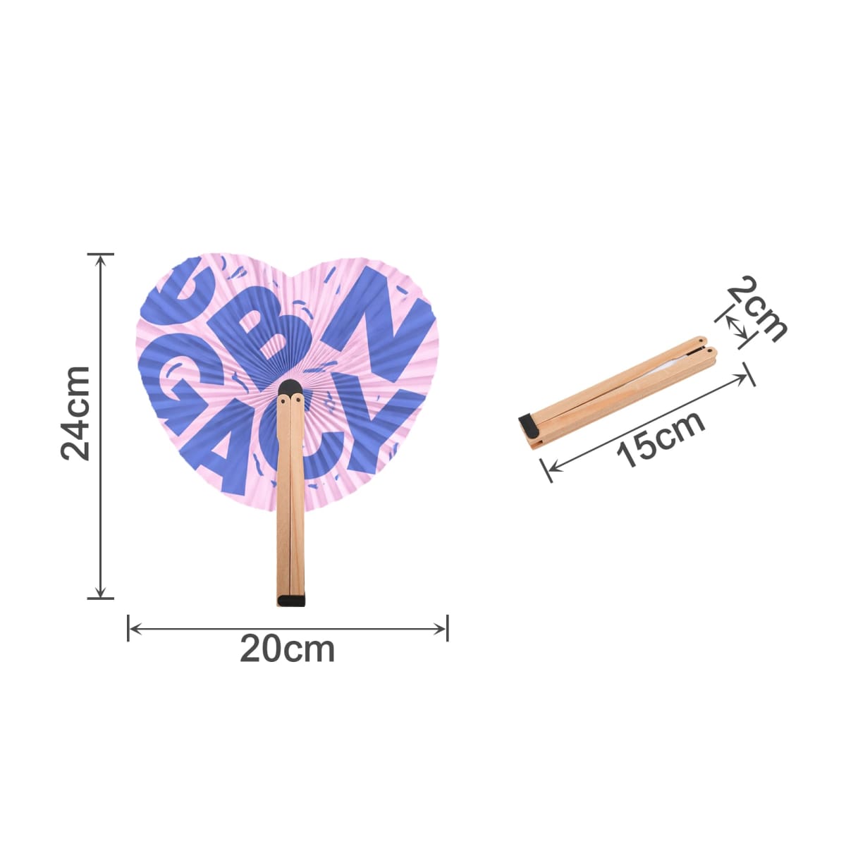 Elevate your brand with our Heart Shape Wooden Paper Fan, featuring a unique heart shape. Crafted from paper and wooden handles, our fan is sturdy and lightweight. Personalise the fan through CMYK to showcase your logos or brand messages. Perfect for outings, tourist souvenirs, or artisan markets, our fan provides a practical way to promote your brand.