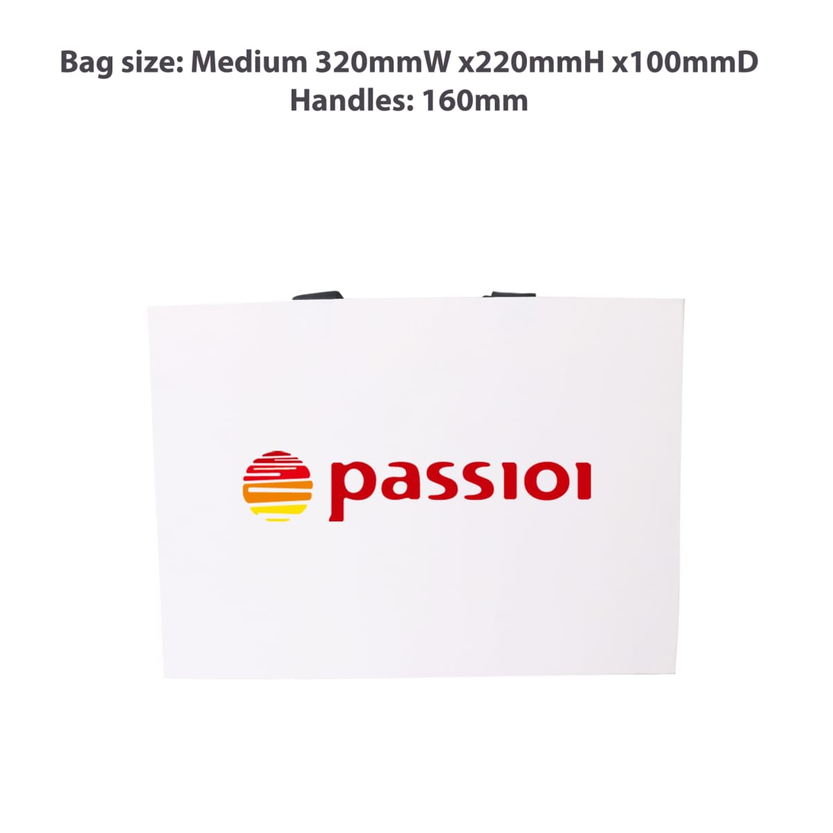 Medium Paper Bag With Handle is ideal for showcasing your elegant branding logos. These personalised paper bags are available to order in a choice of colours, sizes and printing methods. They can be supplied unprinted or custom printed, available with screen print, full-colour print, add-on stickers, add-on stamps, or hot stamping. These paper bags does not only have an excellent capacity for carrying all your goods, but also for displaying your company logo and name. Give them away at any promotional location or take them with you anywhere you go to increase your brand exposure!