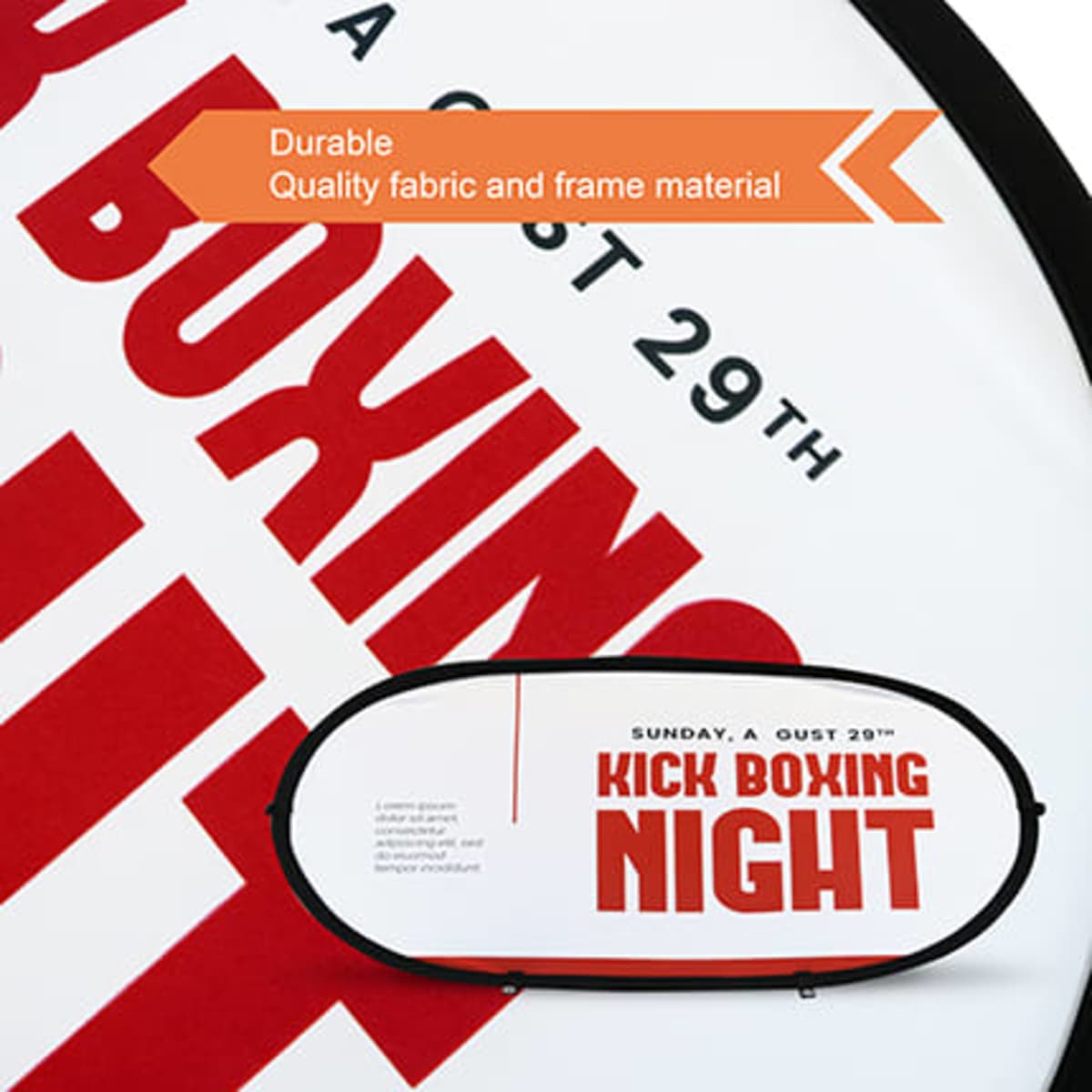 Our Pop Up Banners are lightweight and portable for both indoor and outdoor activities. They can be easily set up in seconds and are great for brand exposure in sporting events during breaks or play. Strong but lightweight flexible frame twists and folds into a compact circle carry bag. The foldable frame also makes them safe to use on sports fields, since they present lower risk of injury to the players.