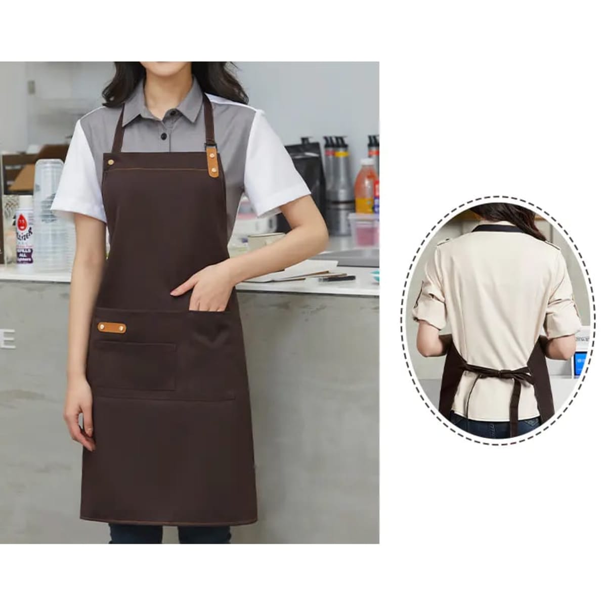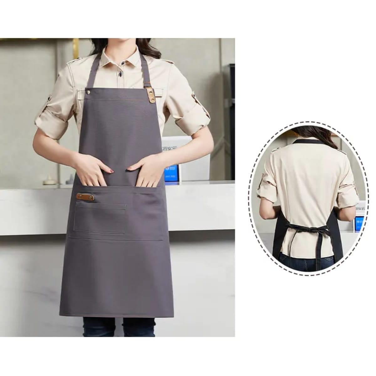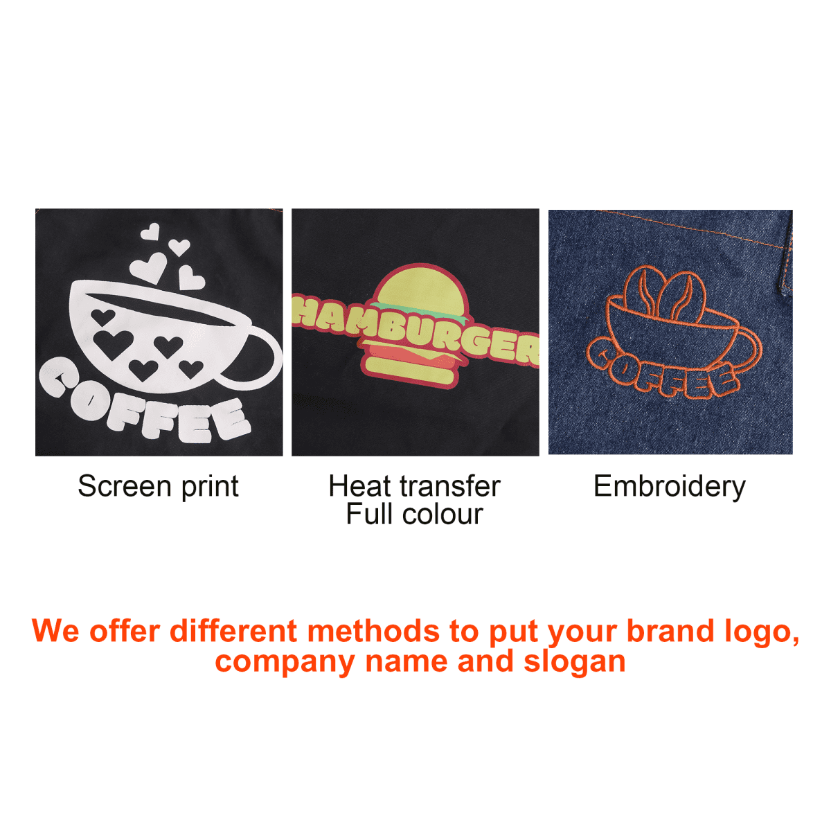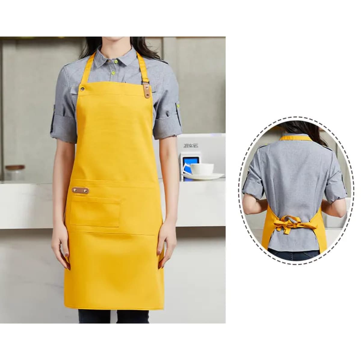 The canvas full bib apron is an ideal choice for restaurant, cafe, and bakery staff. Made of 390gsm 85% polyester and 15% cotton woven fabric, this apron offers durability, easy maintenance and comfort. Its fashionable design features stitches, metal domes, and PU accessories in contrasting colours. The adjustable neck strap with three snap buttons ensures a perfect fit. Additionally, the pen holder made of PU allows for quick and effortless order marking. With four different-sized pockets on the front, you can conveniently store all your essential work items. We offer different methods to put your brand logo, company name and slogan on the smart apron by embroidery, full colour heat transfer and screen print. Don’t hesitate to build up your apron collection this season!