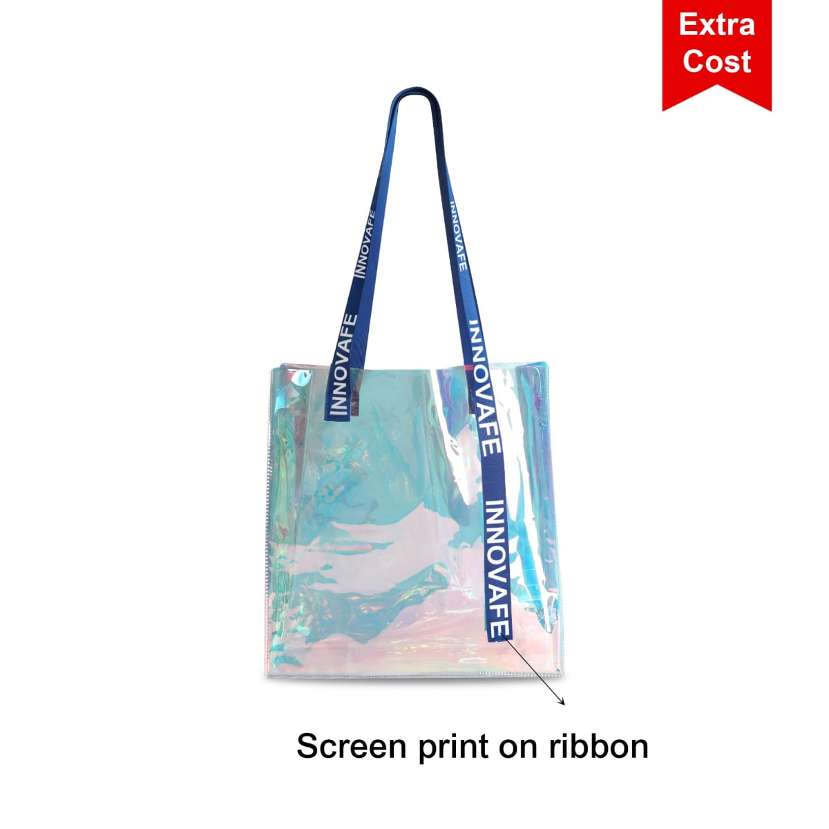 Our PVC Waterproof Tote Bag with holographic design showcases a variety of colors! Made from 0.3mm thickened transparent PVC material, which is waterproof and durable. The braided handle makes the bag more sturdy. With screen print to highlight your brand. It's ideal for shopping, events, the beach or as a stylish everyday bag.