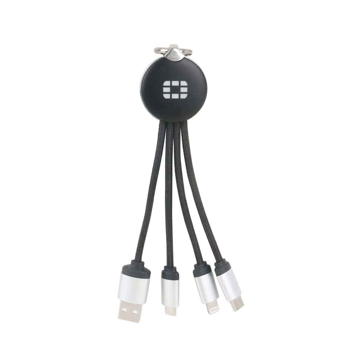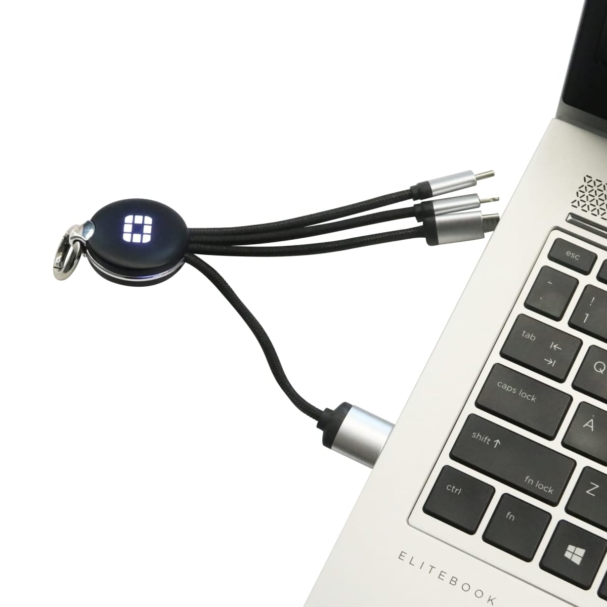 This round shaped light up charge cable comes with double sided light up branding will bring you a convenient way to charge your devices. It features a usb cable with micro USB, Type C, and lighting connectors, so you can power up multiple devices, even if they are different models. What makes this product unique is its anti-angle cable, contrasting connectors and keyring attachment. You can engraved the centre with your logo and light up in white colours on the both sides. This item would surely become the perfect giveaway to promote your hi-tech store.