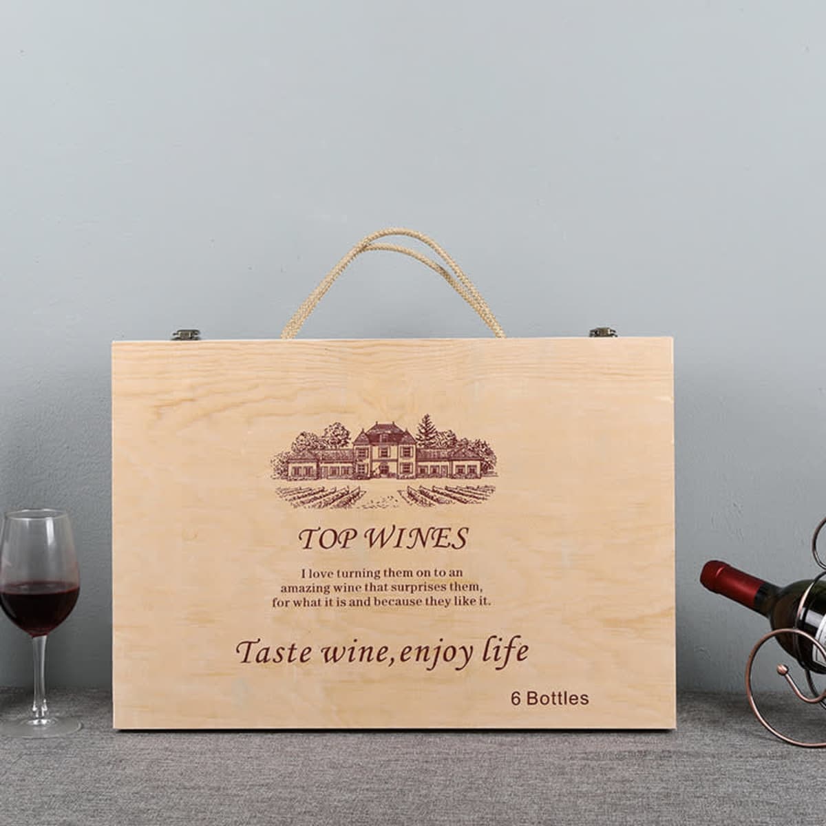 This six-pack vintage wooden wine box is made of selected wood and polished by hand. With fine workmanship, it is your unique and exclusive high-end gift box. It has an inner liner according to the wine bottle, which holds the wine in place and prevents collisions. The clamshell is designed for easy opening. Supports custom logos.