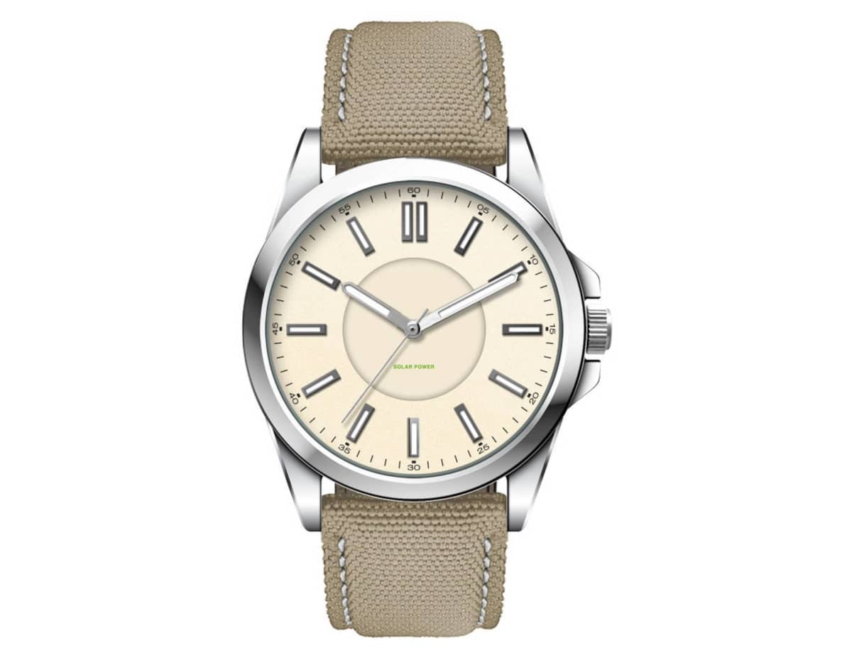 This eco-friendly solar charging unisex watch features an Ionic steel plated alloy case and is water resistant to 3 atm’s. Available with black, beige, blue or white dial. In line with the eco-friendly solar charging, this watch is available with the choice of black, blue or beige rPET nylon straps, all with white stitching.