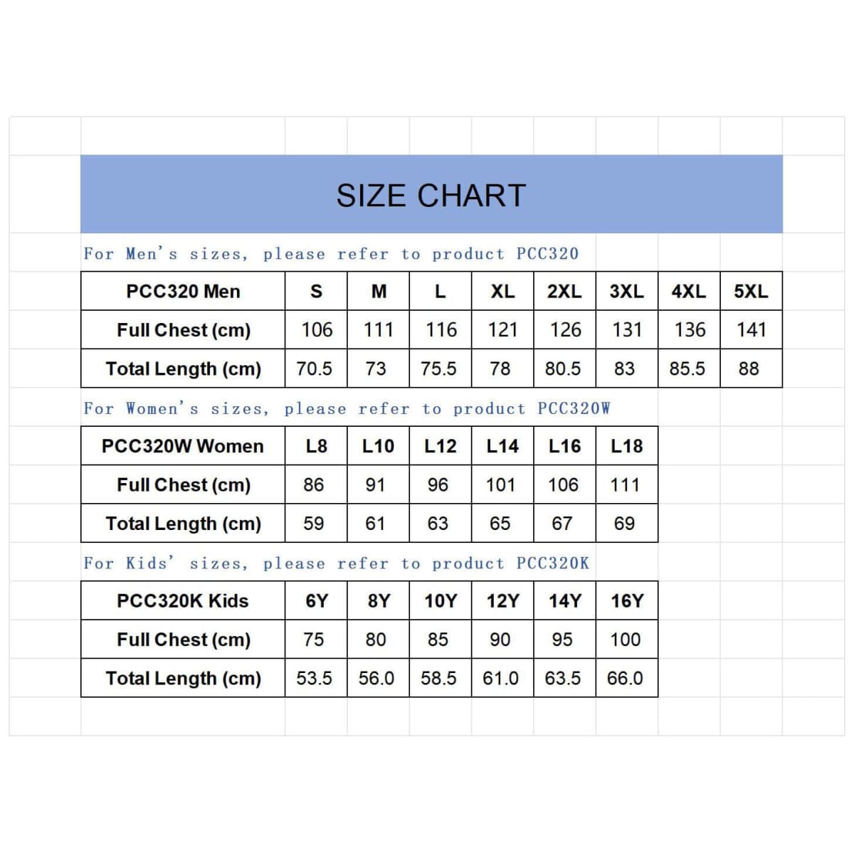 Size S: chest=106cm; Body length=70.5cm Size M: chest=111cm; Body length=73cm Size L: chest=116cm; Body length=75.5cm Size XL: chest=121cm; Body length=78cm Size 2XL: chest=126cm; Body length=80.5cm Size 3XL: chest=131cm; Body length=83cm Size 4XL: