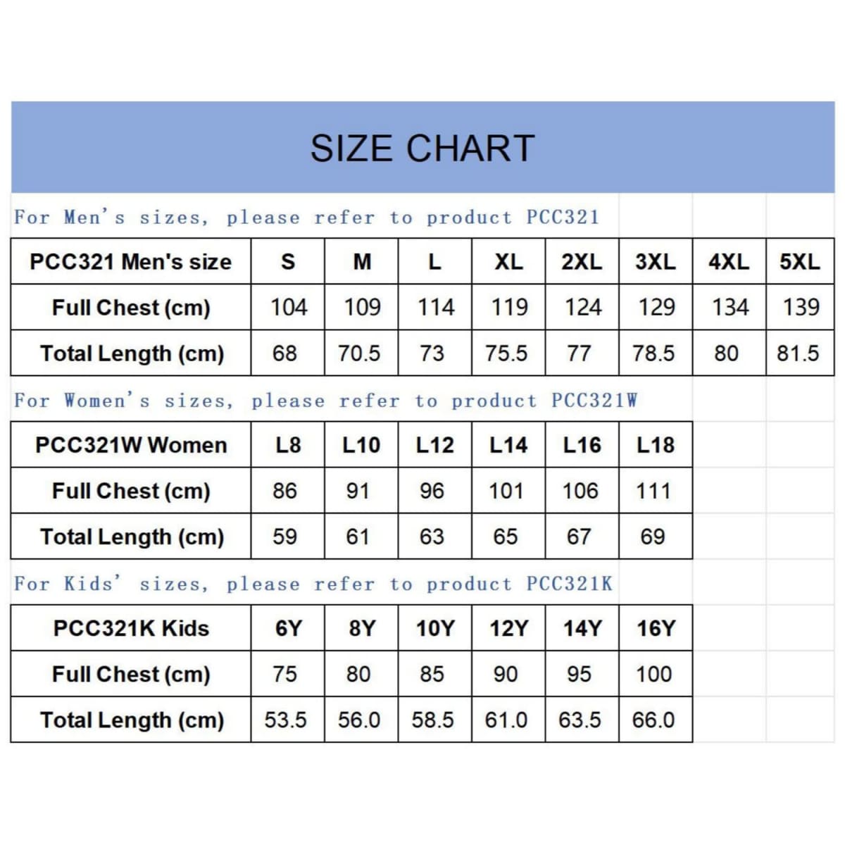 Size S: chest=104cm; Body length=68cm Size M: chest=109cm; Body length=70.5cm Size L: chest=114cm; Body length=73cm Size XL: chest=119cm; Body length=75.5cm Size 2XL: chest=124cm; Body length=77cm Size 3XL: chest=129cm; Body length=78.5cm Size 4XL: