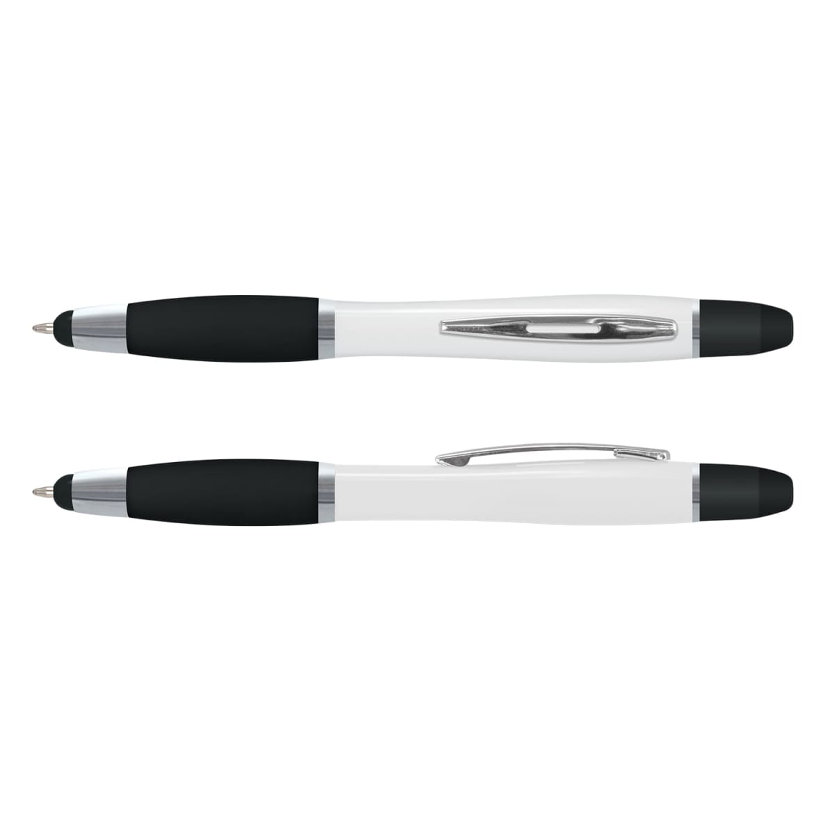 Twist-action plastic ballpoint pen with a white barrel, a soft-touch grip and shiny chrome trim. It has a stylus for use with touch screens and a yellow wax highlighter which will never dry up. Vistro has a black refill with 600 metres of German manufactured Dokumental ink and can be presented in an optional pen sleeve.