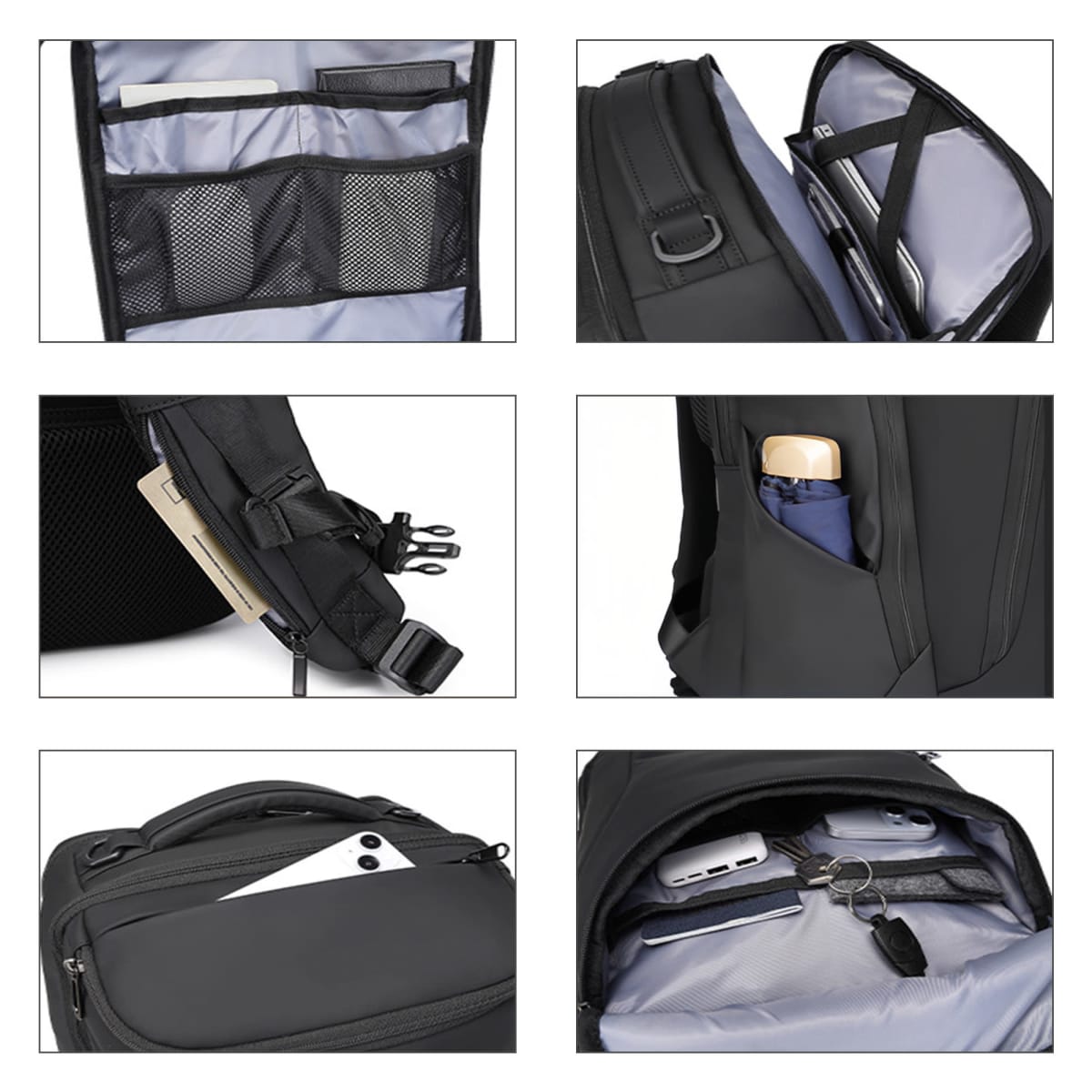 This Waterproof Business Backpack is the perfect business companion which fits up to your 16" laptop, featuring 3 front zipper pockets for essentials, a side pocket for bottles, a main pocket with USB charging and a back pocket especially for your laptop. Our quality backpack is made of polyurethane and Oxford material, that is water resistant and durable. You can showcase your design with silicone print.